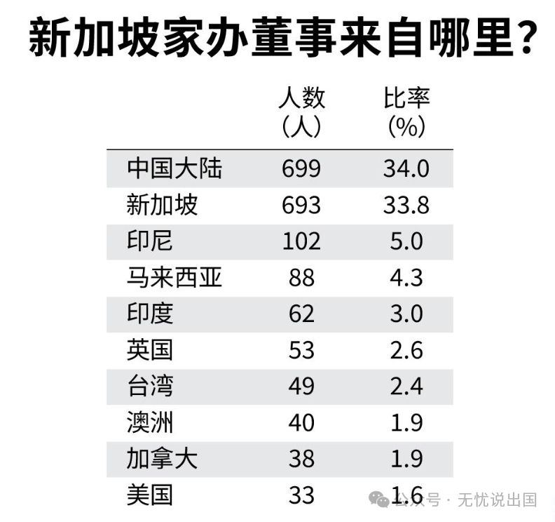 截至2023年8月,新加坡有2053名单一和多户家办董事,大部分来自中国大陆,共699人,占总董事人数的34%;新加坡董事693人。注册地址在中国的中国籍董事中,来自香港占大多数,约有20%(91人),另有76人和56人来自上海和广东,占17%和12%。可见大多数的中国资金是从香港转移出去的。
