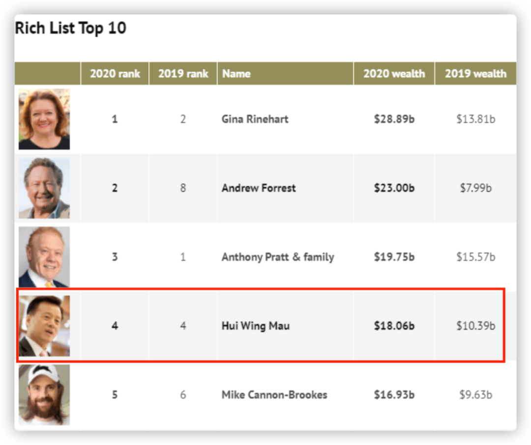 2020年澳洲富豪榜里,共有250位亿万富豪上榜,其中排名第四的是一位华人,身价180.6亿澳元(890.2亿人民币),他也再度成为了澳洲华人首富。