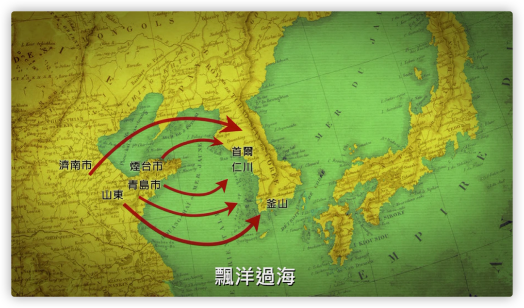 在清朝末年,山东战乱不断,大批的山东人从山东半岛乘船越黄海,登陆仁川、釜山和当时的汉城,登陆后,就在当地经营农业、饮食业和建筑业。