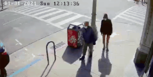 1月31日,加州奥克兰的唐人街上,一名亚裔老人被人从背后推倒,重重摔在地上。