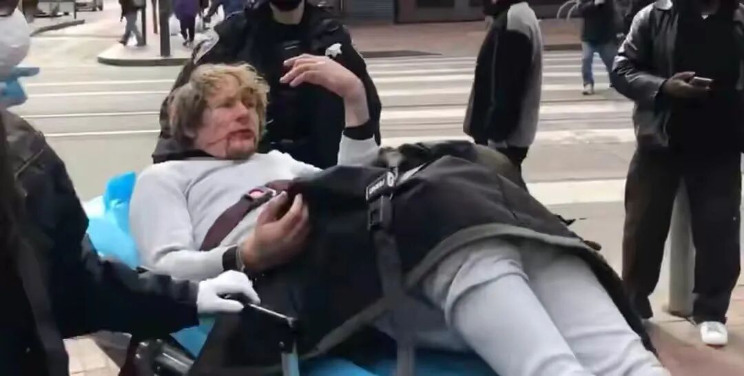 3月17日,一名75岁的华人老太太在旧金山市场街遭到袭击,不过这位老太太非常神勇,她立即抄起一根木棍,反将袭击者打到抱头鼠窜,等到警察来时,只能用担架将袭击者抬走。