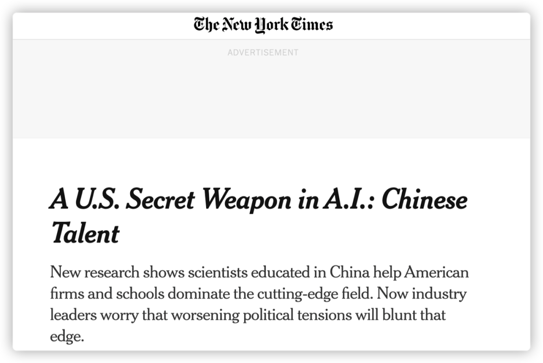 美国的《纽约时报》曾经专门刊文报道这一现象,标题为《美国人工智能领域的秘密武器:中国人才》。