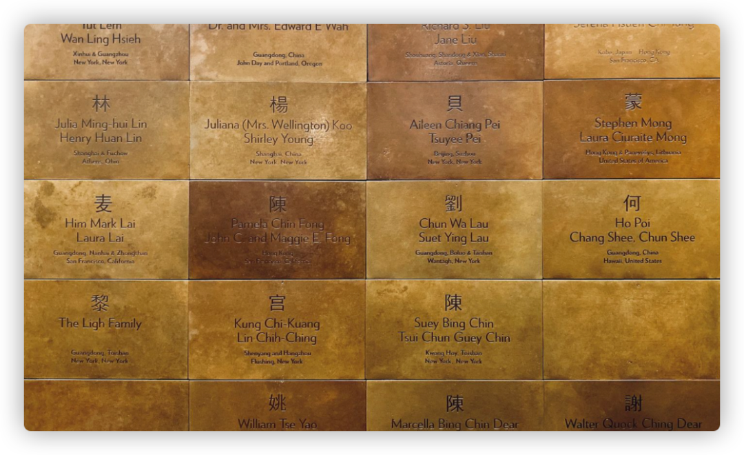 每一块铜片上,用中英文镌刻着姓氏、祖籍和移民美国的居住地。简单的几行字,背后都是一个华人家族在美国的奋斗史。