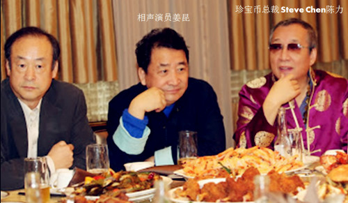 在珍宝币发行后不久,姜昆曾到美国富豪集团的总部参观,并且与陈力在一起吃饭,看照片还算相谈甚欢。后来在珍宝币的宣传资料上,姜昆的照片也与另外三位创始人并列在一起。
