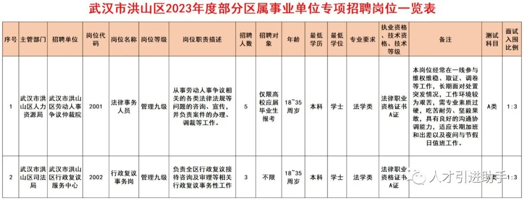 此次专项招聘共8人,其中,洪山区行政复议服务中心招聘3人,洪山区劳动人事争议仲裁院招聘5人。