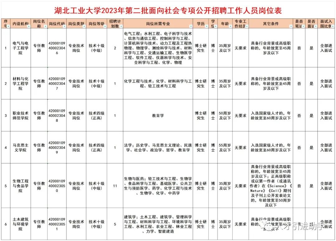 1.湖北工业大学2023年第二批面向社会专项公开招聘工作人员岗位表