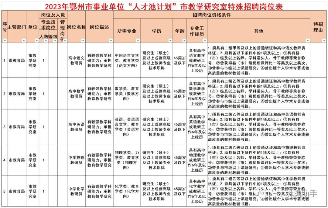 1.2023年鄂州市事业单位“人才池计划”市教学研究室特殊招聘岗位表