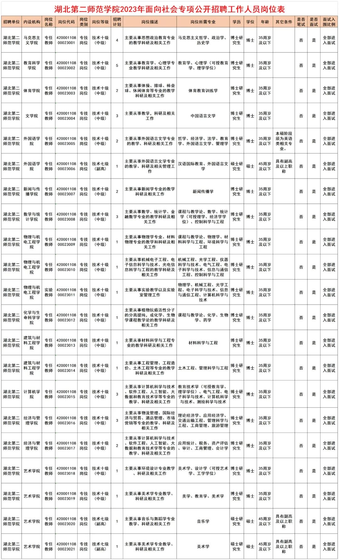 1.湖北第二师范学院2023年面向社会专项公开招聘工作人员岗位表