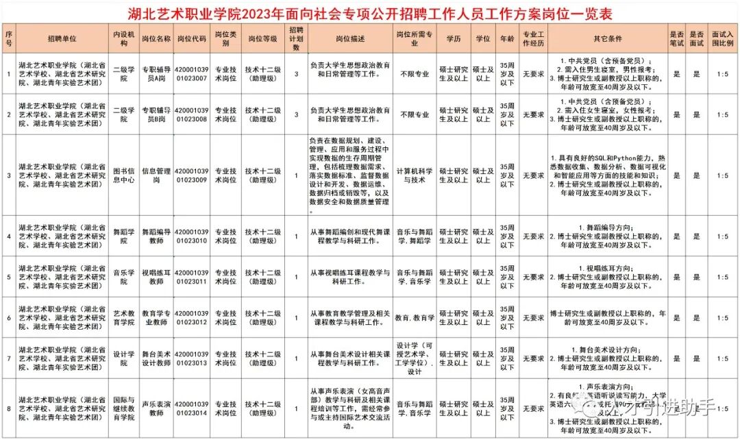 1.湖北艺术职业学院2023年面向社会专项公开招聘工作人员岗位一览表