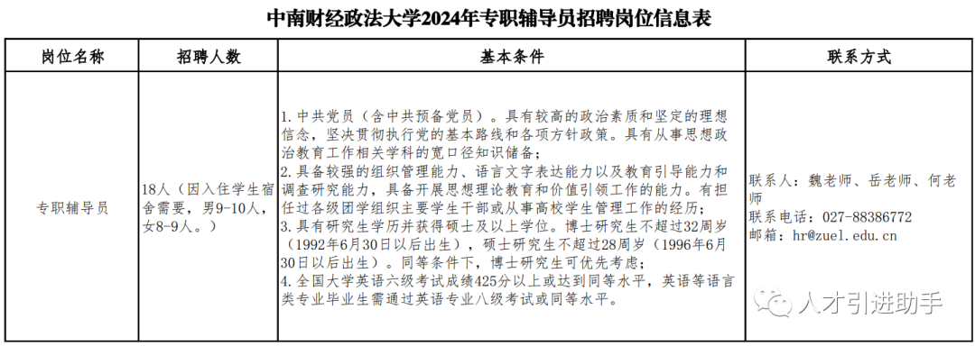 1.中南财经政法大学2024年专职辅导员招聘岗位信息表