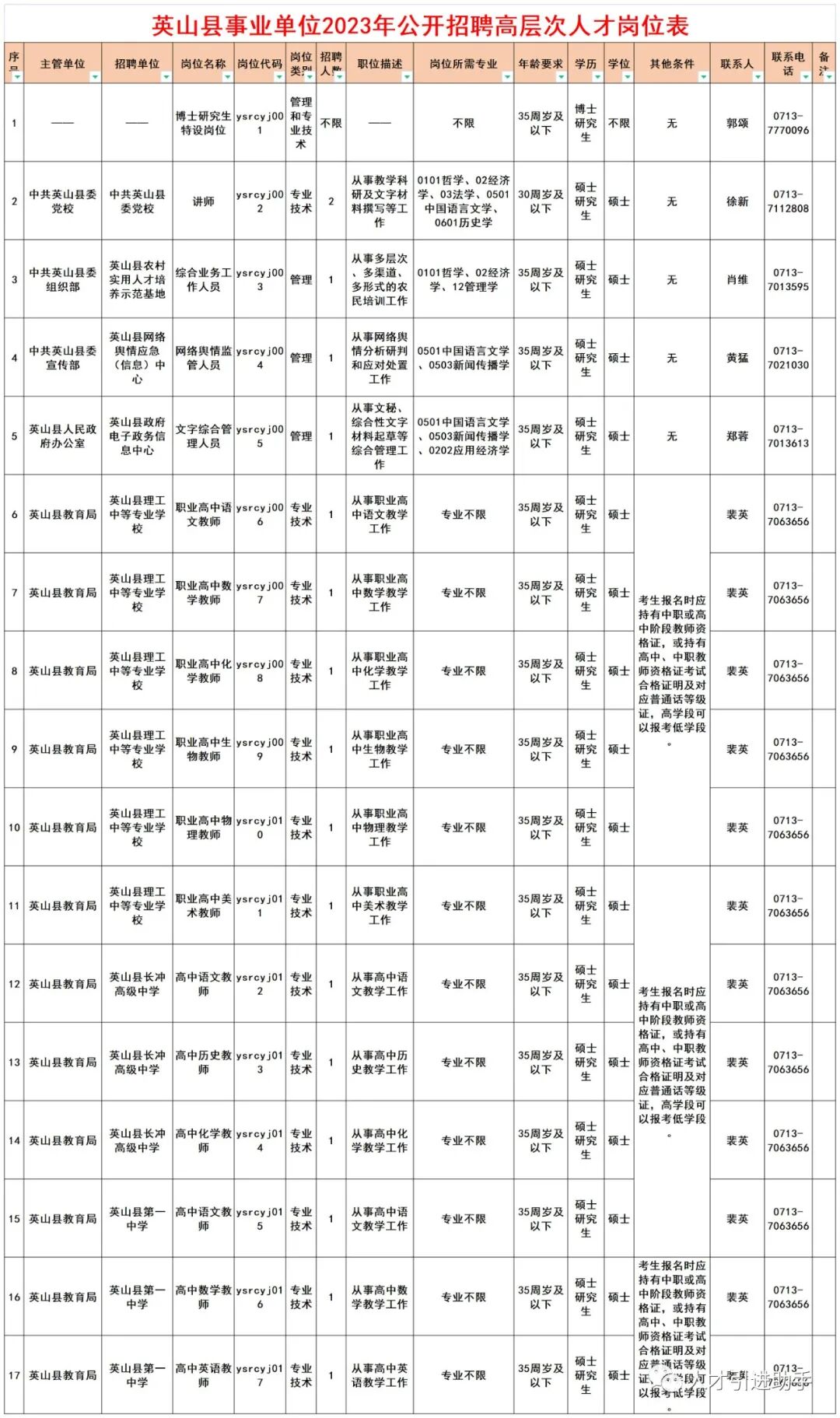 1.英山县事业单位2023年公开招聘高层次人才岗位表