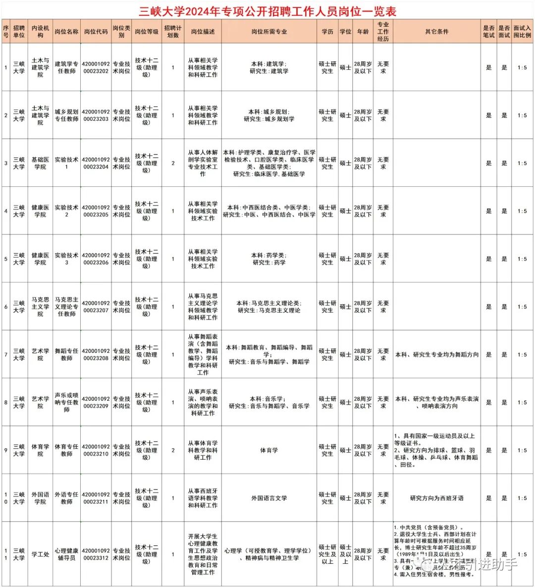 1.三峡大学2024年专项公开招聘工作人员岗位一览表