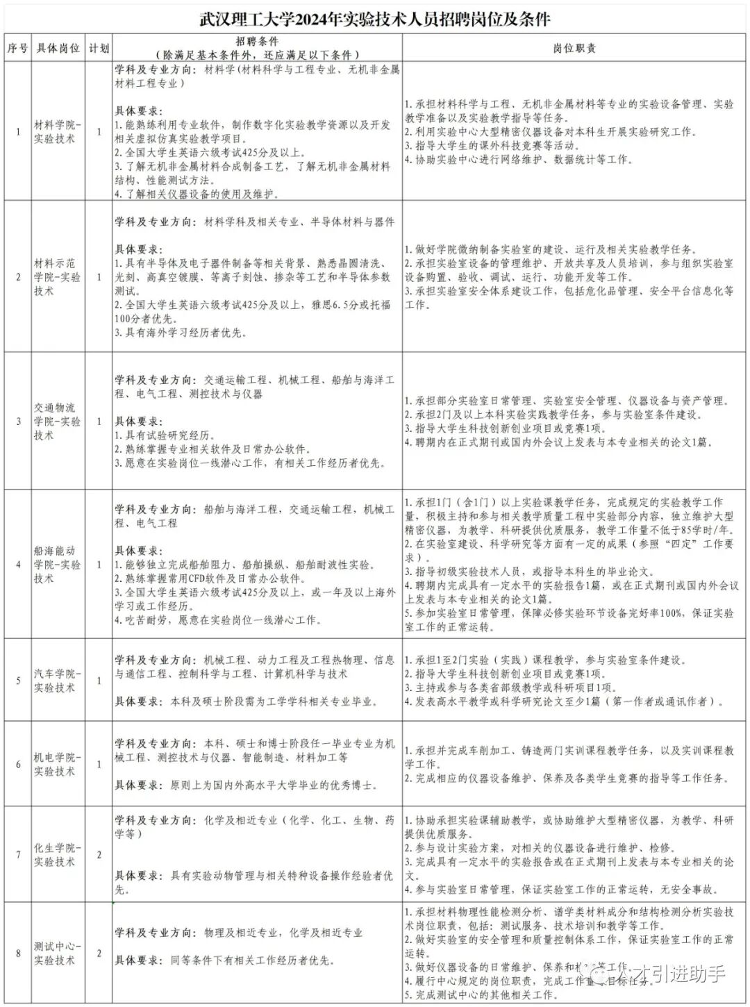 武汉理工大学是教育部直属全国重点大学,是首批列入国家“211工程”和“双一流”建设高校,是教育部和交通运输部等部委共建高校。为促进学校可持续发展,加强实验技术人员队伍建设,根据学校工作安排,决定公开招聘实验技术人员10名。现将有关事项公告如下: