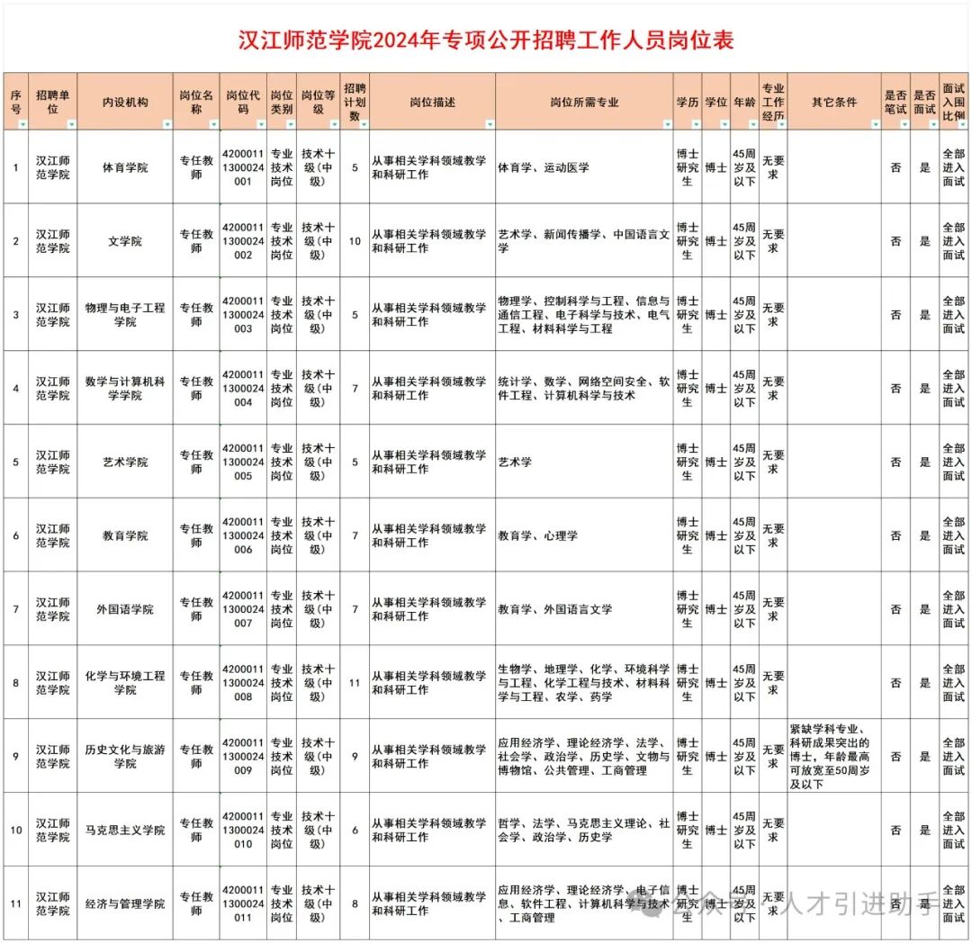 1.汉江师范学院2024年专项公开招聘工作人员岗位表