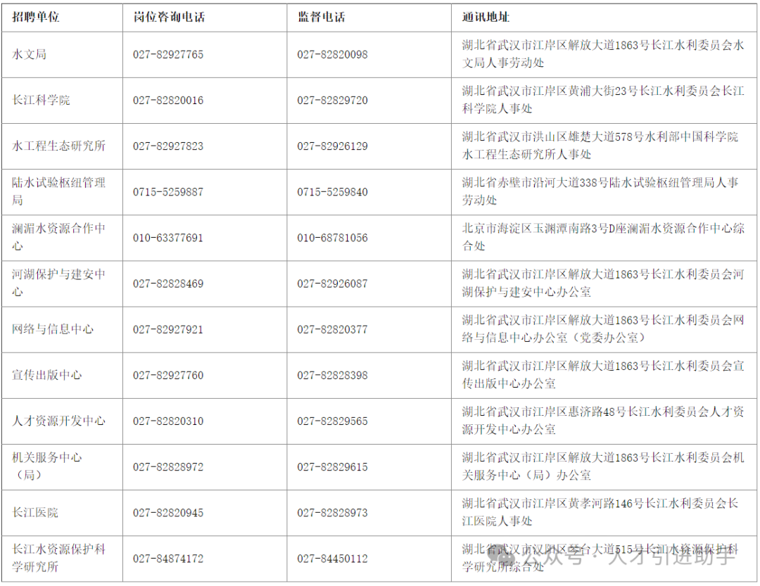 2.时间地点。综合笔试时间暂定为2024年3月下旬,地点暂定为长江水利委员会人才资源开发中心(湖北省武汉市江岸区惠济路48号),报名确认成功的报考人员请登录长江水利委员会公开招聘服务平台打印准考证,具体时间、地点请关注相关通知。如遇问题,请拨打技术咨询电话或联系招聘单位解决。