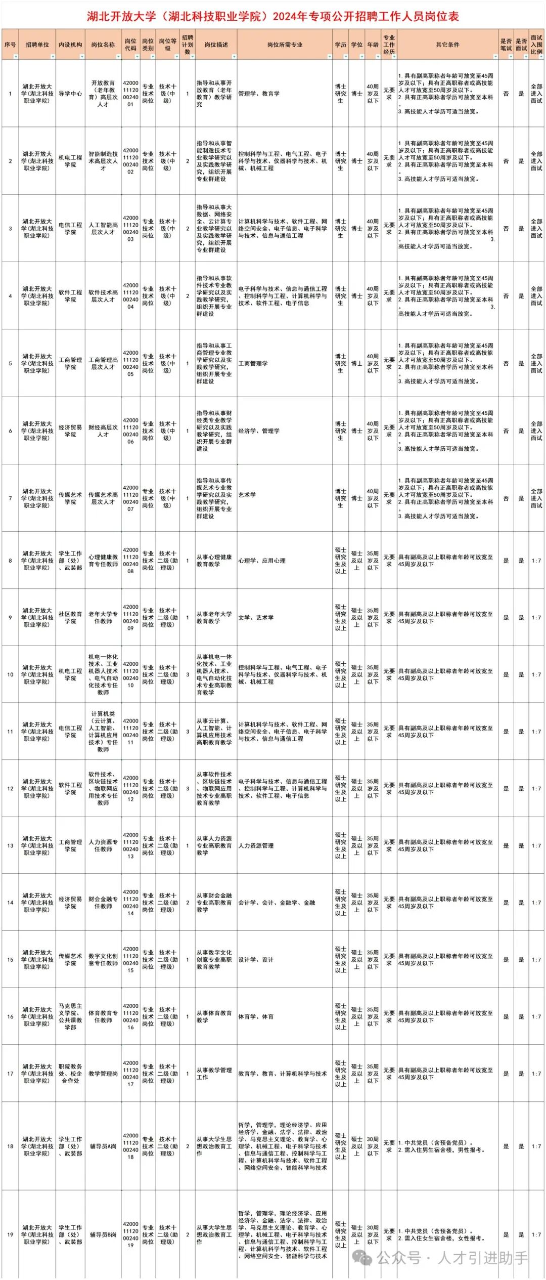 4.每位应聘人员最多可申请1个岗位,请应聘人员及时关注湖北开放大学(湖北科技职业学院)人事处网站(http://rsc.hubtvu.net.cn/),以便查看考试通知及相关消息。