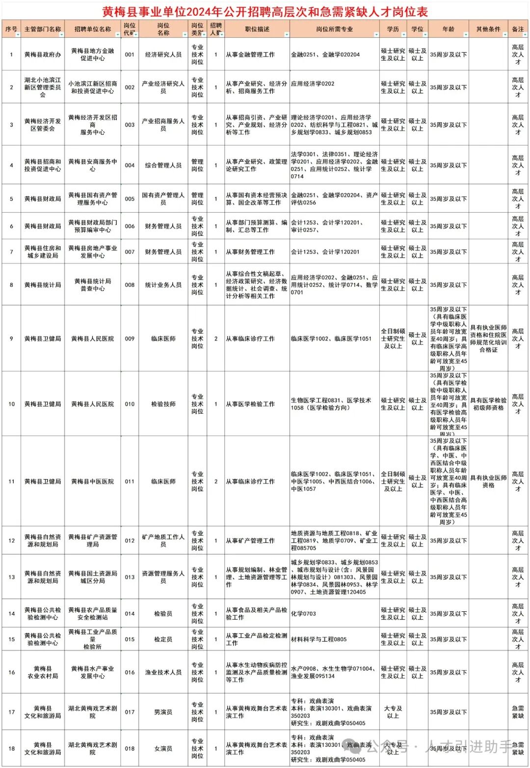 1.黄梅县事业单位2024年公开招聘高层次和急需紧缺人才岗位表