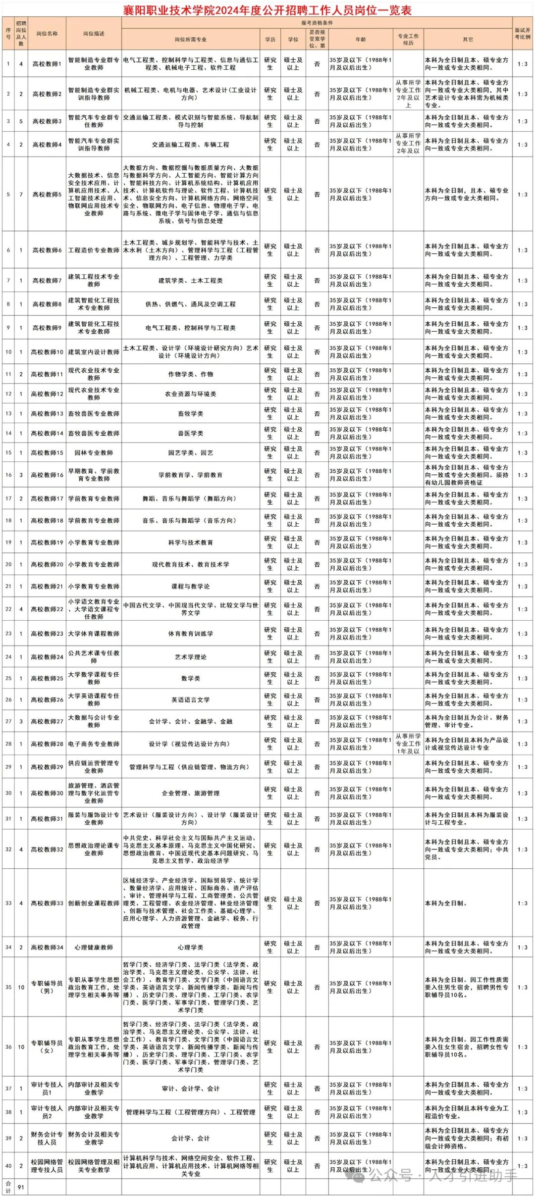 1.襄阳职业技术学院2024年度公开招聘工作人员岗位一览表