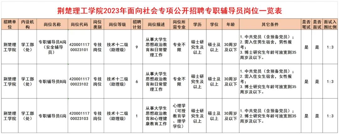 1.荆楚理工学院2023年面向社会专项公开招聘专职辅导员岗位一览表