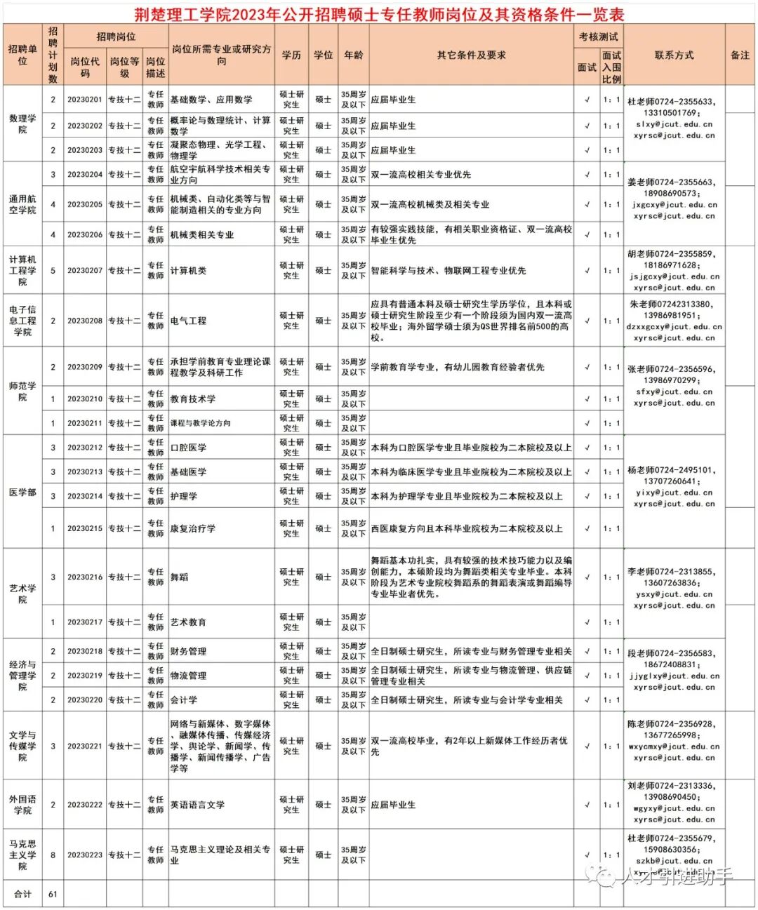 荆楚理工学院2023年公开招聘硕士专任教师61人。
