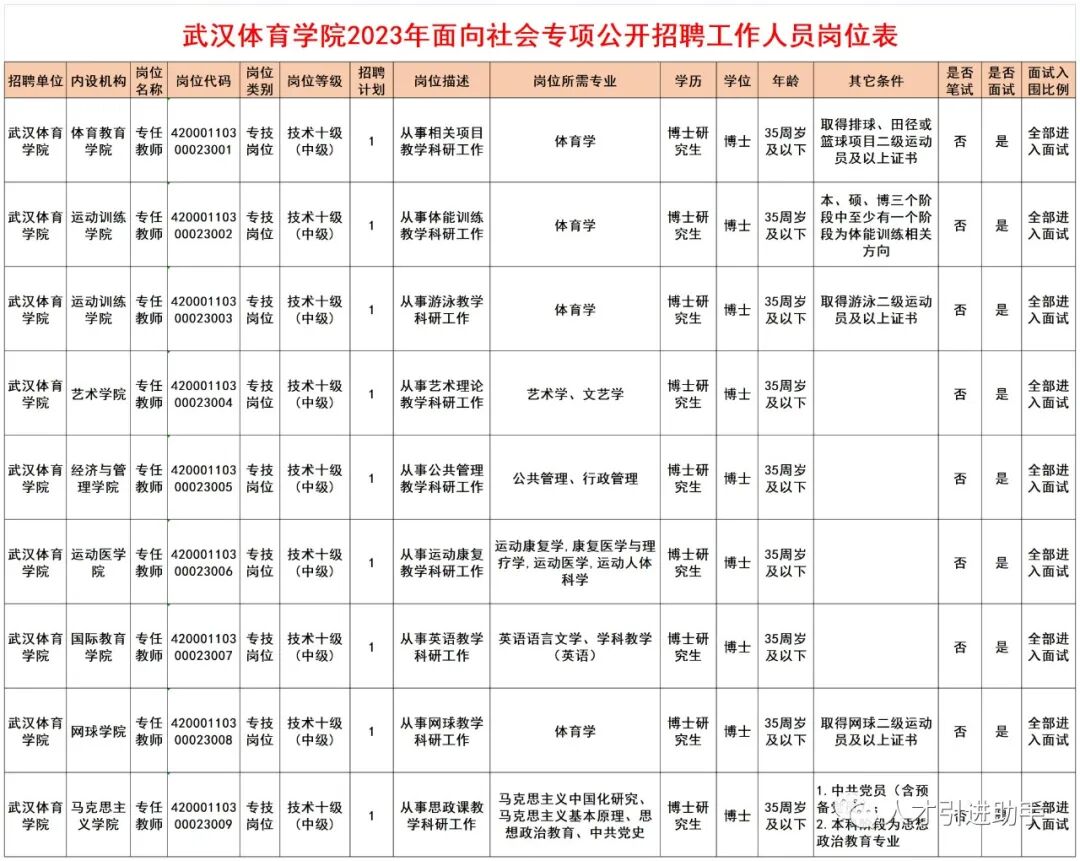 1.武汉体育学院2023年面向社会专项公开招聘工作人员岗位表