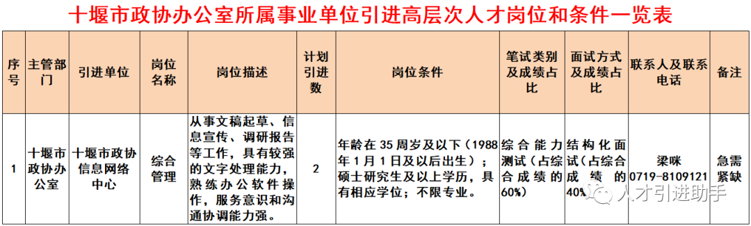 1.十堰市政协办公室所属事业单位引进高层次人才岗位和条件一览表