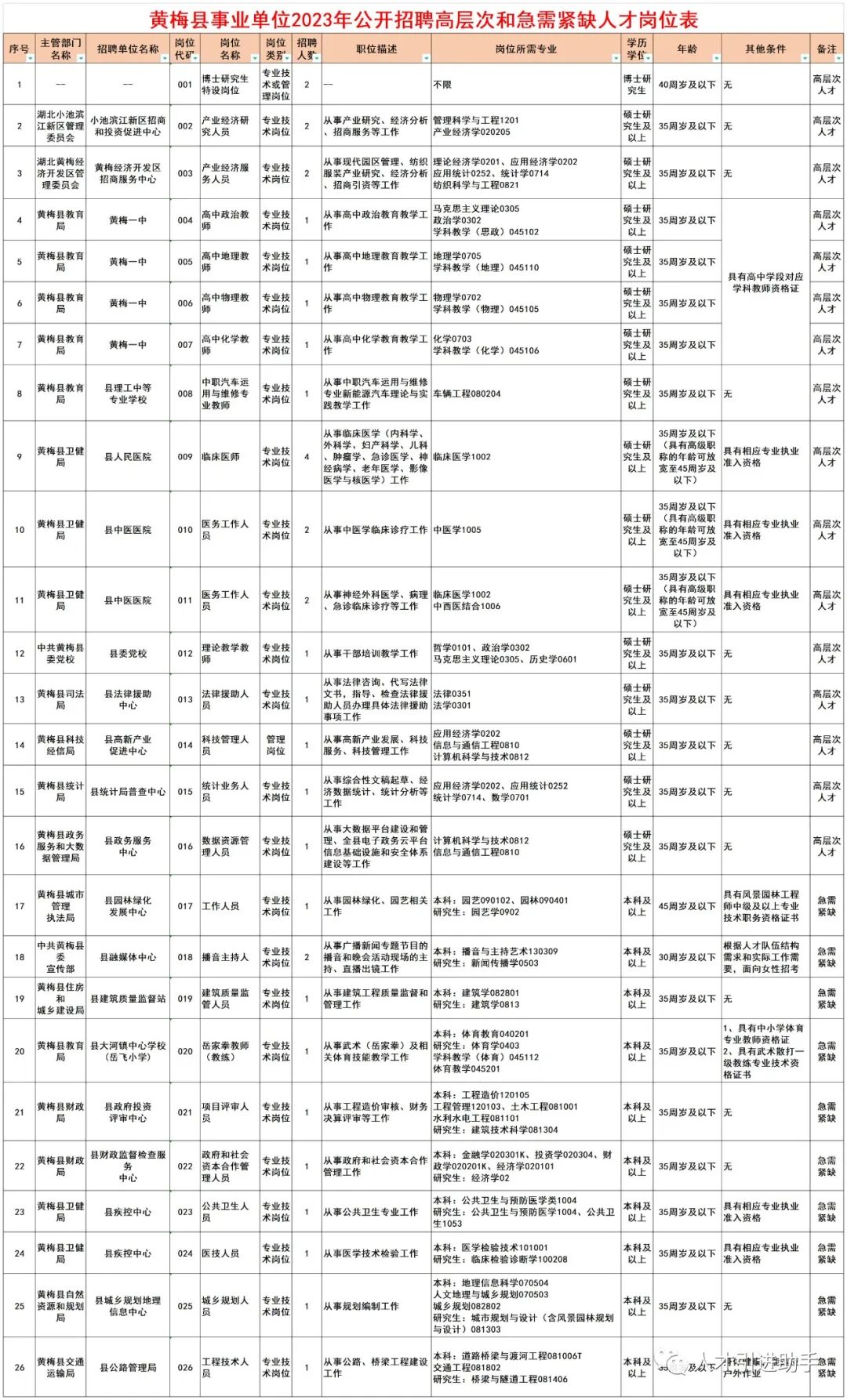 1:黄梅县事业单位2023年公开招聘高层次和急需紧缺人才岗位表