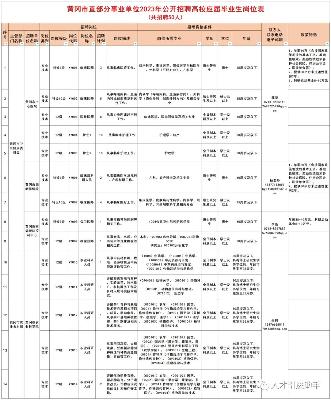 黄冈市直4家事业单位共14个岗位,计划招聘博士研究生6人、硕士研究生及以上学历9人、本科及以上学历35人,共计50人。