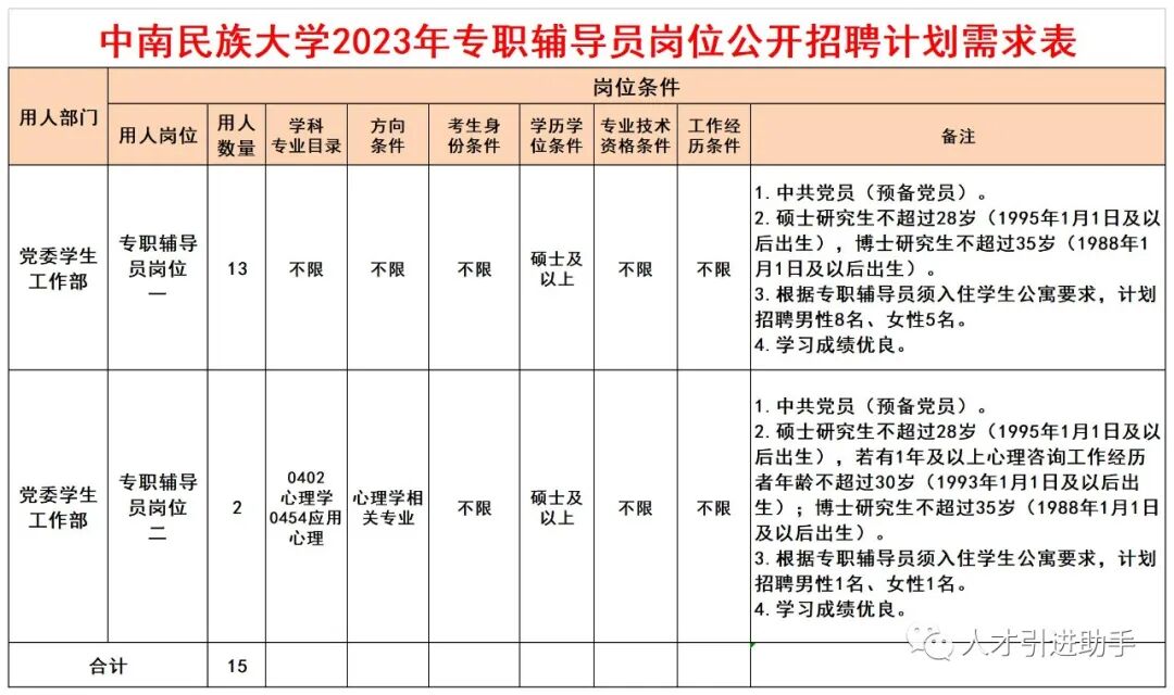 1.中南民族大学2023年专职辅导员岗位公开招聘计划需求表