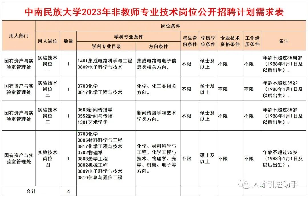 根据《事业单位人事管理条例》和事业单位公开招聘有关政策规定,结合学校事业发展需要,中南民族大学2023年面向社会公开招聘非教师专业技术人员4名。