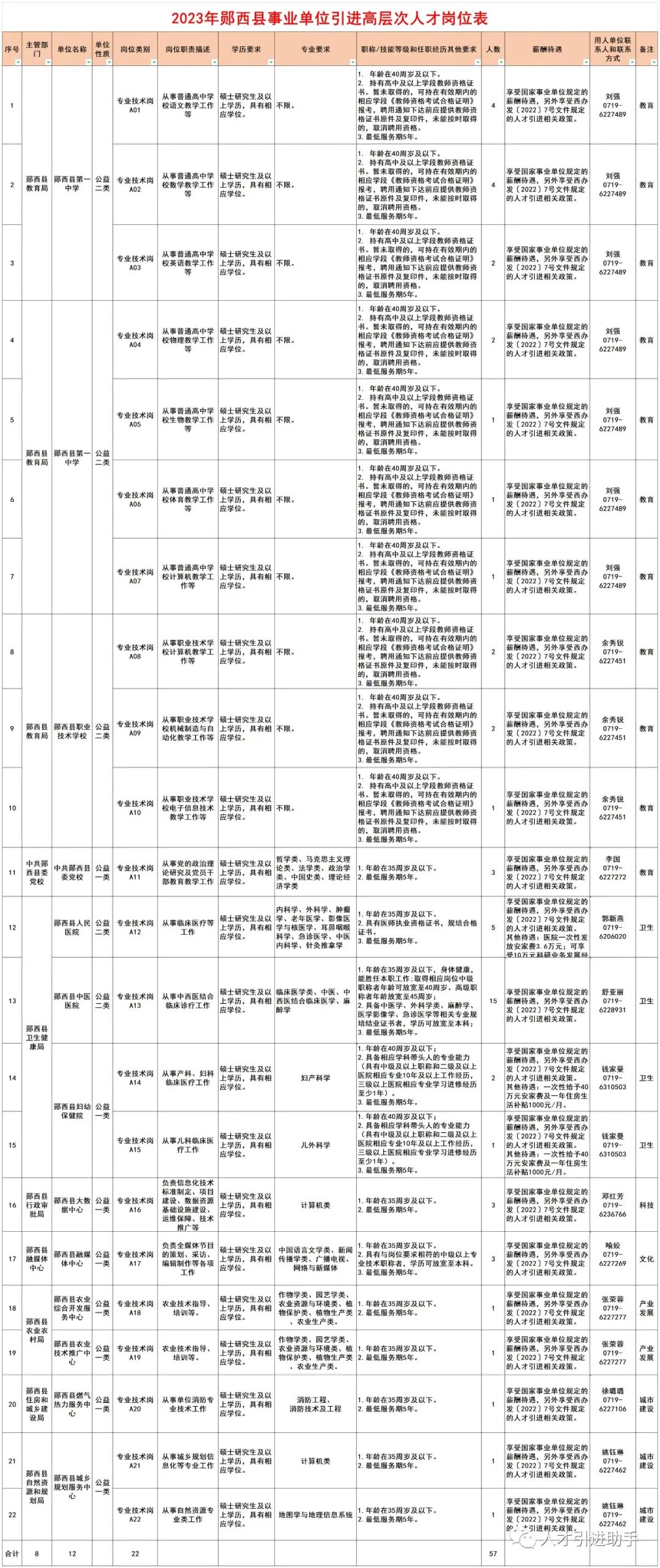 咨询电话:中共郧西县委人才工作领导小组办公室