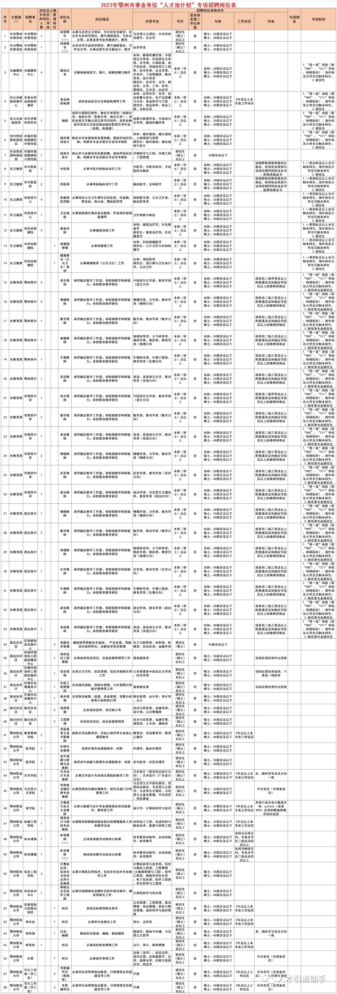 1.2023年鄂州市事业单位“人才池计划”专项招聘岗位表