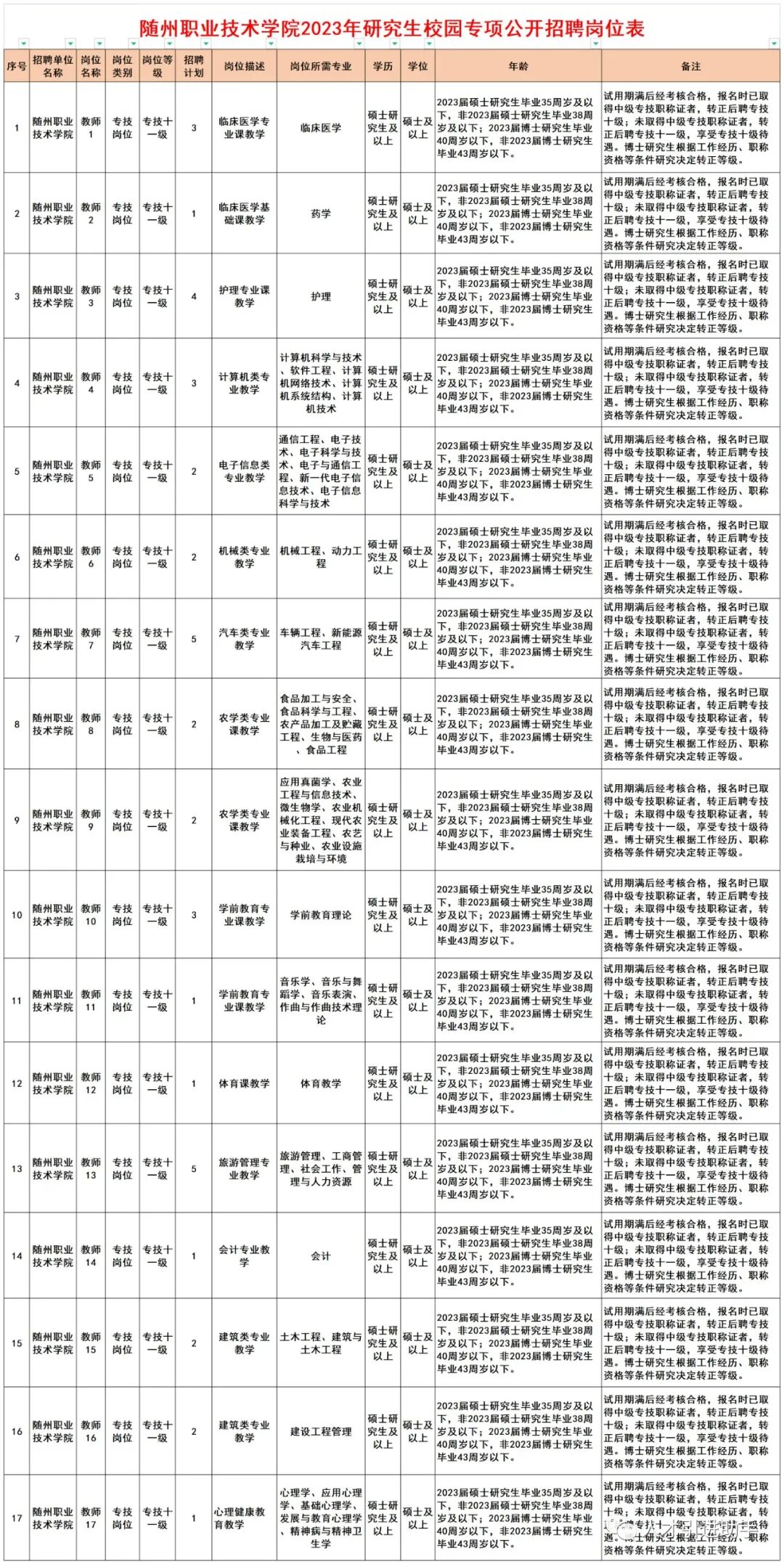 1:随州职业技术学院2023年硕士研究生校园专项公开招聘岗位表