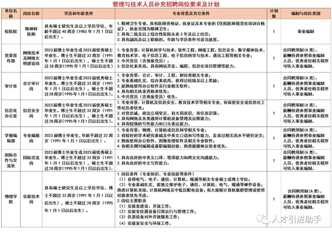 1:华中师范大学2023年管理与技术人员补充招聘岗位要求及计划