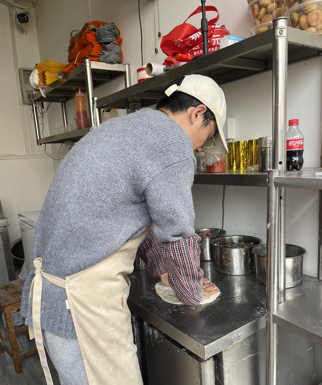 何家俊:我是衢州人,做烧饼是家族手艺,我父母在杭州已经开店 10 多年了,生意很好,家里其他亲戚也都在上海等城市开了店。既然家里有这个资源,我觉得不能浪费。