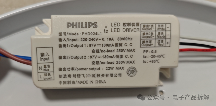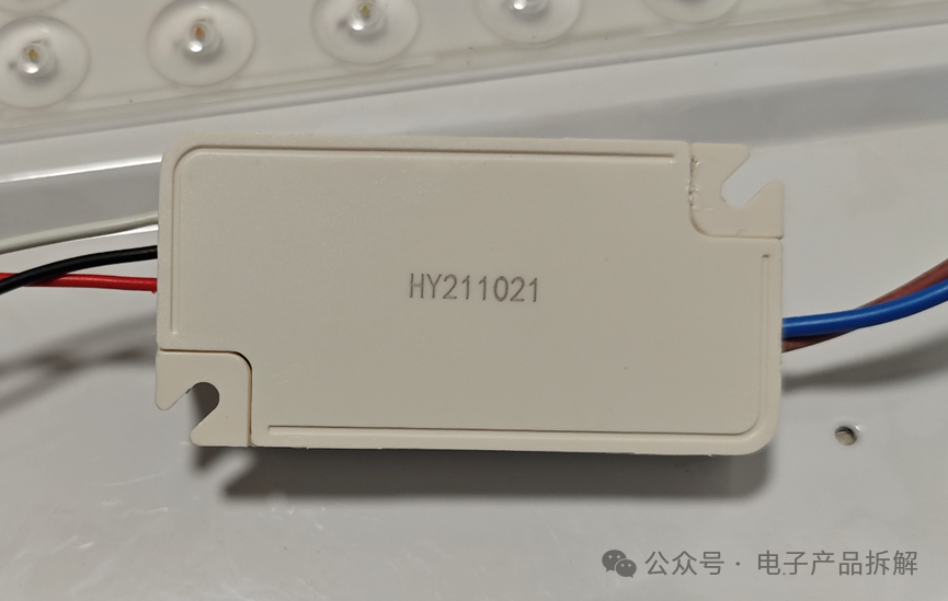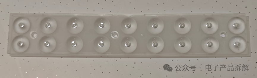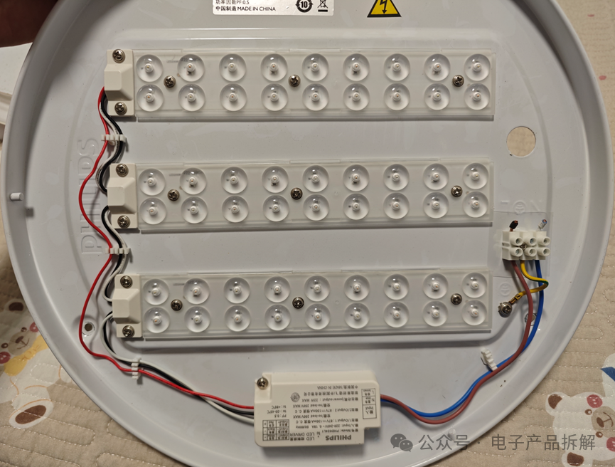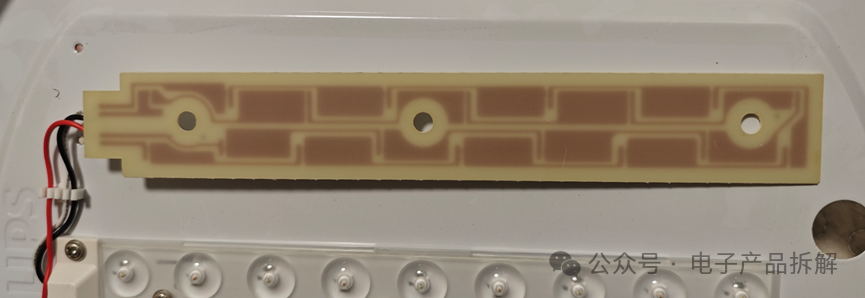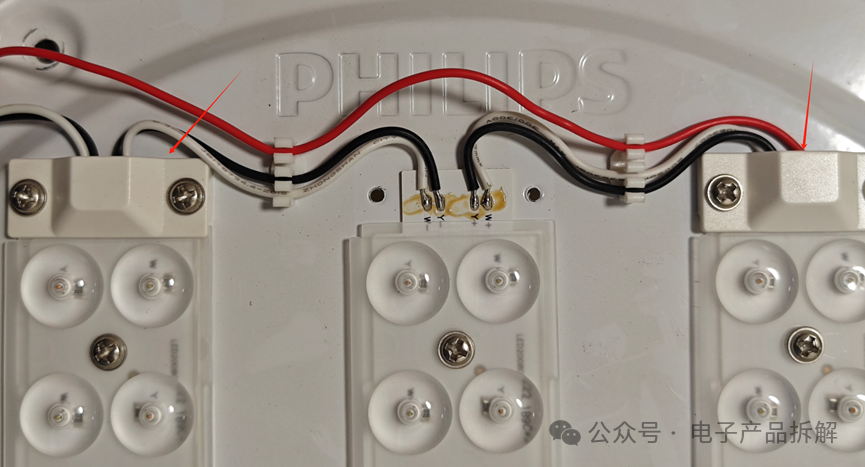 要把灯板拆下来,需要先把顶头的这个塑料盖板拆下来。拆下来之后可以看到线是怎么焊接的。可以发现这三个灯板是串联的,但是由于每个灯板上有两种不同色温的灯,所以是三个板子上相同色温的灯串联。这两串灯是共阳极的,驱动端控制的是阴极,这个从之前的电路图里也可以看出来。