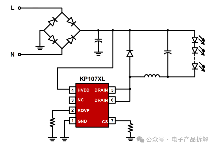 这两个SOP-7封装的芯片,丝印KP1070LSP,型号是KP107XL。该芯片的功能是:非隔离、降压型准谐振LED功率开关。主要的应用场景就是大功率LED照明。下面是简单的原理图。
