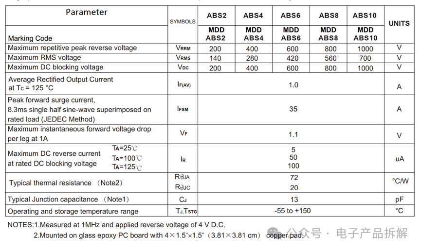 整流桥的型号是ABS10,厂家是MDD,这个整流桥的详细数据如下。