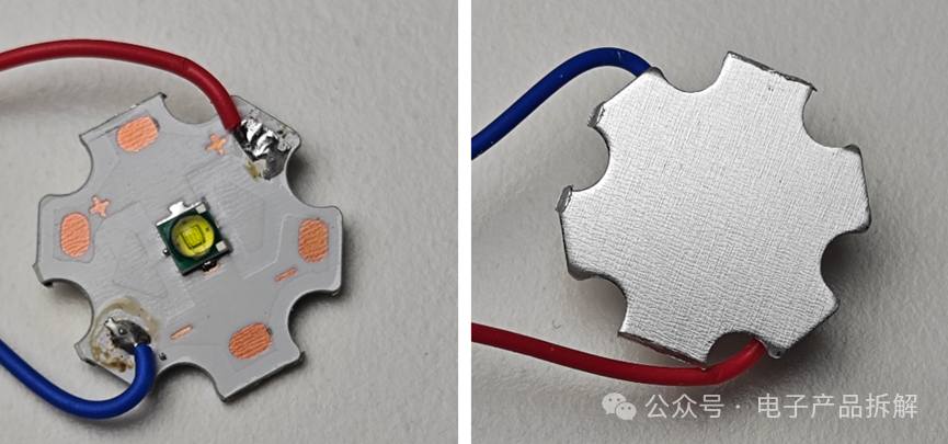 可以看到内部的电路板还是比较简单的,单面板,另外可以看到灯板是铝基板。没有直接用FR4或者纸做的PCB,而是用了铝基板,这在不到4元的手电筒上还是值得肯定的。