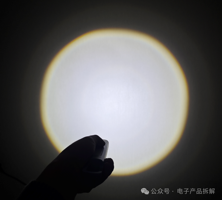 是骡子是马,拉出来溜溜。作为一个手电筒,看看光怎么样才是最关键的。通过调节上面这个图上的套套的套入深度,还可以调焦距,详情页的说法是“伸缩调焦”。总而言之就是通过这个套入深度可以改变光斑大小。那我们先试试不把这个套套拔出来。