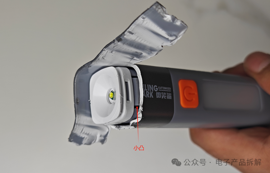 走到这一步,拆解工作基本上已经柳暗花明。先把白色的这个东西拆下来,然后破坏掉小凸和小凸的孪生弟弟,就可以把套套从手电筒上拿下来了,我把这个行动称为“第二次分头行动”。拿下来之后,大概就是这个样子的。经过虎口钳的一番攀谈交心,套套对我们敞开了它的怀抱,伸出了点赞之手。