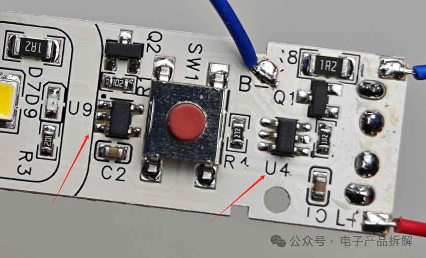 其中一颗IC的丝印是2329,封装是SOT23-6,这个芯片的1脚通过旁边的1k电阻驱动三极管Q1,进而驱动头部的铝基板上的LED发光。3脚通过1k的电阻R1驱动Q2,进而驱动这个板子上的LED灯(侧灯)发光。4脚连接按键SW1。5脚接18650电池的正极,6脚接地。通过如此丰富的信息,我没有找到这到底是个什么芯片。但是根据丰富的硬件设计经验,我猜这是一颗单片机,或者是一个专用的ASIC。它的功能就是接受按键输入、驱动两路MOS或者三极管作为开关、电池电压测量等功能。目前做SOT23-6的单片机的公司还不少,比如微芯、应广、芯圣、辉芒微、锐盟、合泰、富满、博巨兴等等。