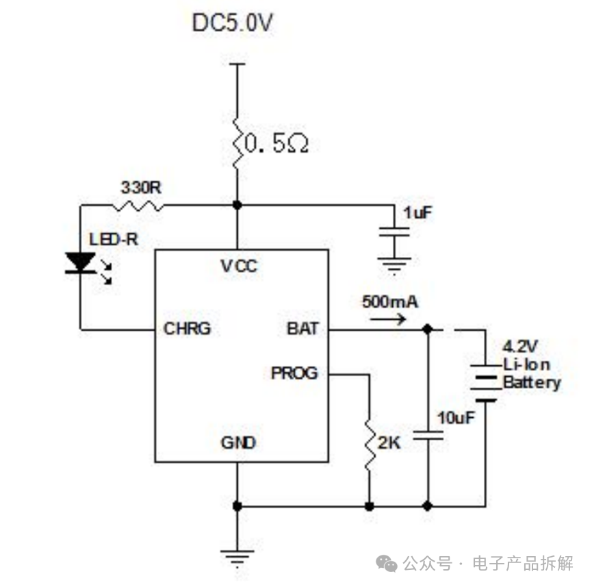 另一个IC封装是SOT23-5,丝印是LTH7R,这个丝印一眼就可以看出来是锂电池充电芯片,对着丝印找了一下大概可能是富满的(并不百分百确定),富满的这个充电芯片名字就叫LTH7R/J,和TP4054这种是兼容的。手册中的原理图如下,可以通过5脚的电阻来设置充电电流大小,充满之后1脚的灯状态会发生变化。