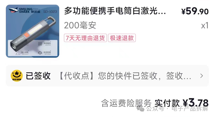 准确说,这个手电筒是斥资3.78大洋入手的,包邮是必须的。