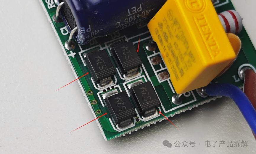 四个SMB封装的整流二极管,丝印S2M,疑似品牌为台湾迪嘉。这个二极管的最大峰值电压1000V,最大电流是2A。四个管子组成了如下的整流电路。