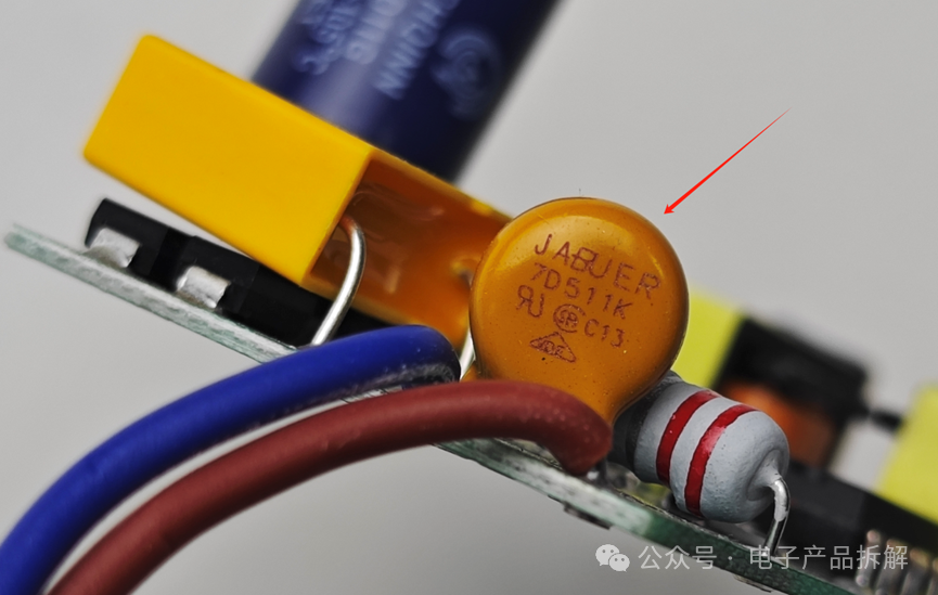 压敏电阻的型号是7D511K,没找到对应的厂家信息。压敏电阻的作用主要是和保险丝配合使用,降低电路中的脉冲电压,从而保护后端电路不被损坏。