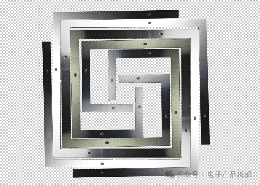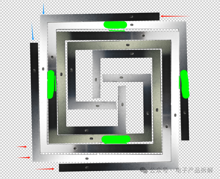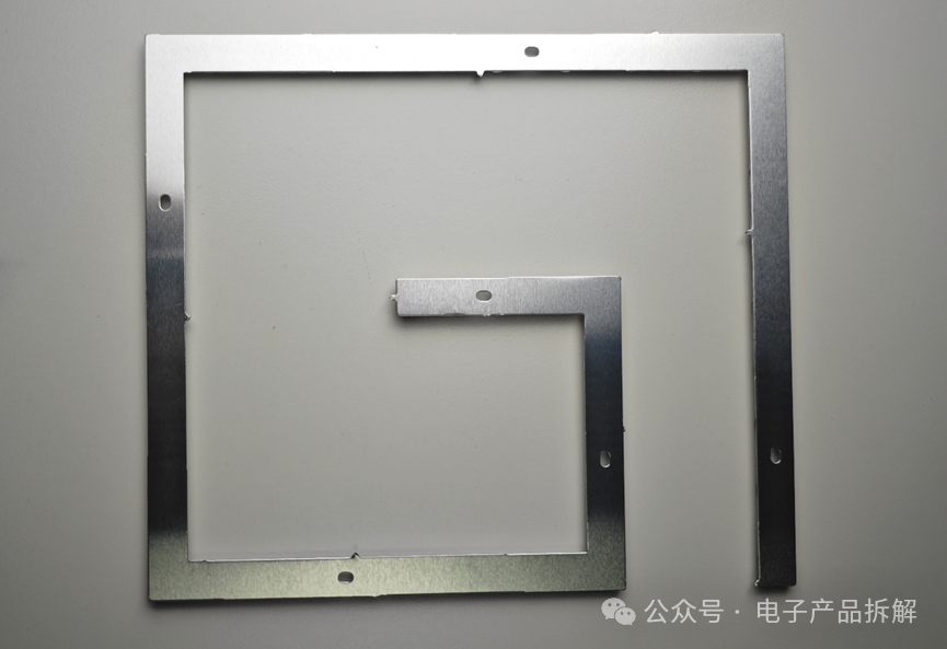 不过令小马哥诧异的是,这个形状的板子,简直就太浪费铝基板了。这个板子的长和宽是21cm*19cm,板子最宽的地方也就13mm也就是说1平方米只能做25个这个板子,那就意味着单个PCB的成本得将近十块钱了,这有点恐怖啊。本文原创发布于公众号电子产品拆解。所以我试着用PS把这个形状抠出来,然后尝试着拼了一下板子,果然让我发现了一点不一样的东西,直接上图,由于拍照时稍有畸变,所以看起来有点歪,请多包涵。