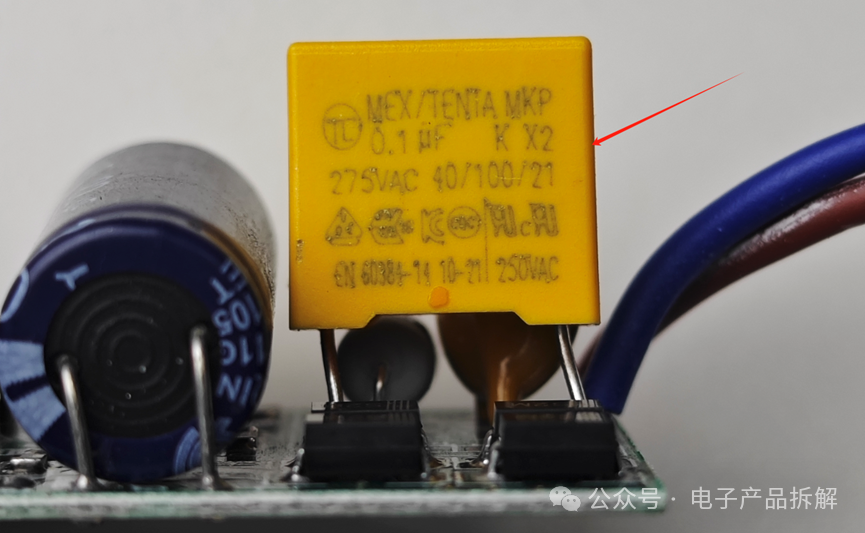 X2安规电容的容值是0.1uF,275VAC,品牌天泰。