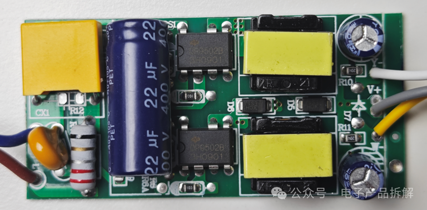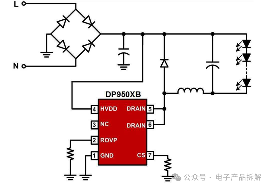 最大的这两个DIP-7封装的 IC,丝印是DP9502B,是一款非隔离,降压型准谐振LED功率开关。说得再直白点,这个芯片是一个集成恒流的LED功率开关。可以看到这个Drain输出和LED之间有串联一个电感。