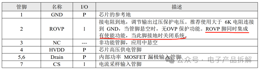 注意,这个芯片的2脚ROVP同时集成了使能功能。当此引脚接地时关闭系统。所以后面所讲的LED色温控制,就是通过控制这个引脚来实现对应色温的LED的亮灭的。